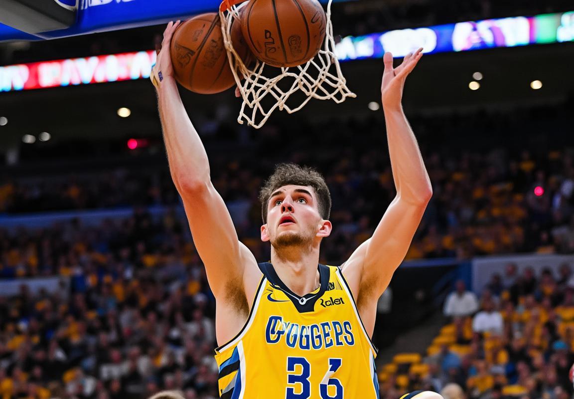 约基奇的策略调整面对霍姆格伦的跃起,约基奇迅速做出了反应。他放弃了原本的防守位置,选择了更接近篮筐的贴身防守。他的眼神紧盯着对手,准备在空中展开一场防守与进攻的较量。